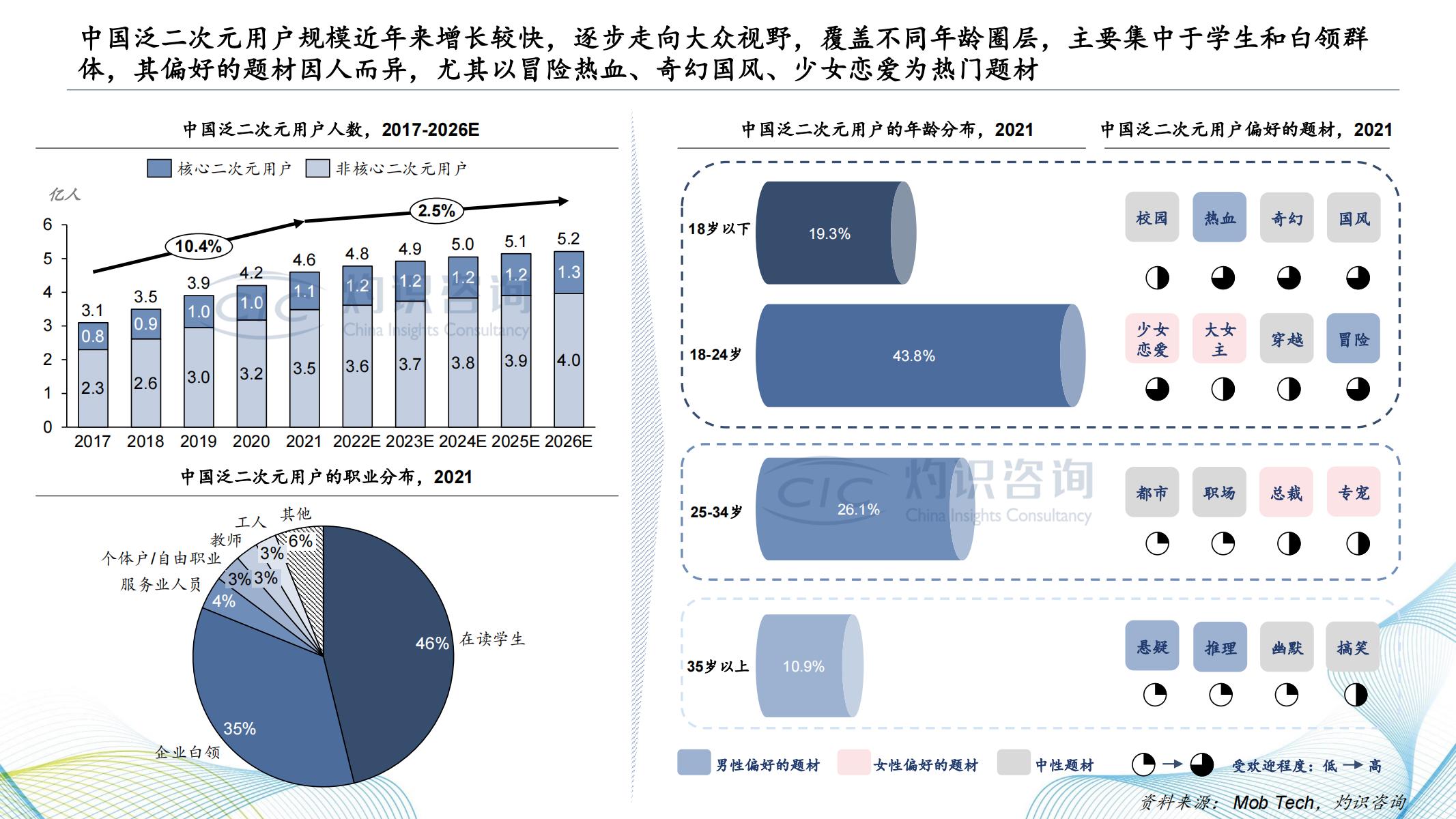 2021年国内泛二次元用户规模已达到纳4.6亿人,该类群体对二次元内容和周边具有较高的消费意愿和能力,其偏好的题材以眉险热血、奇幻国风、少女恋爱为主。