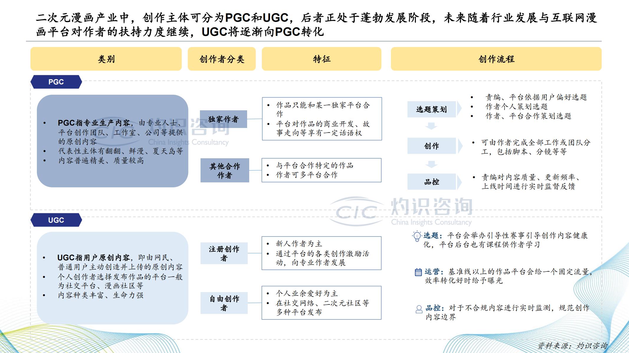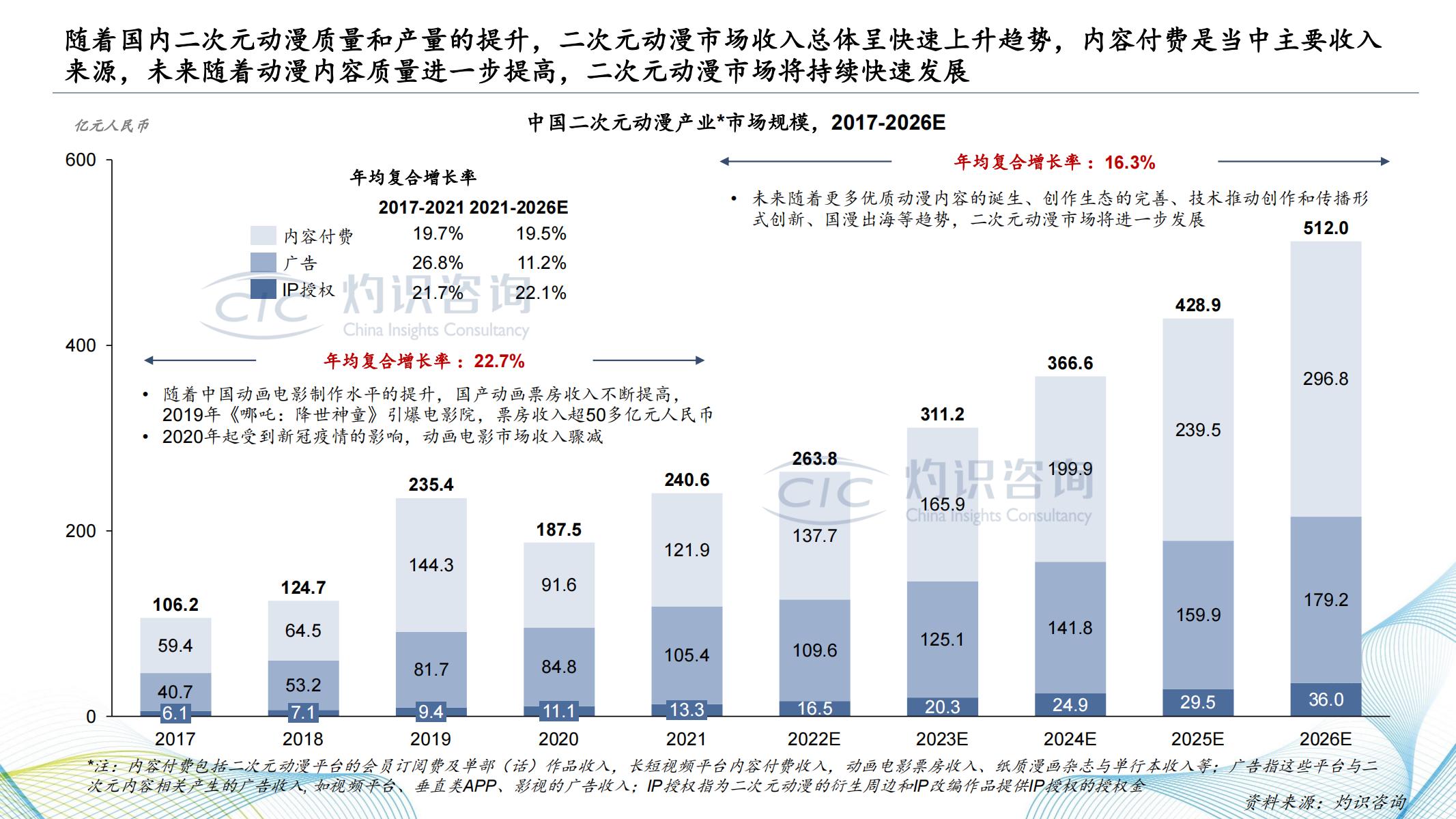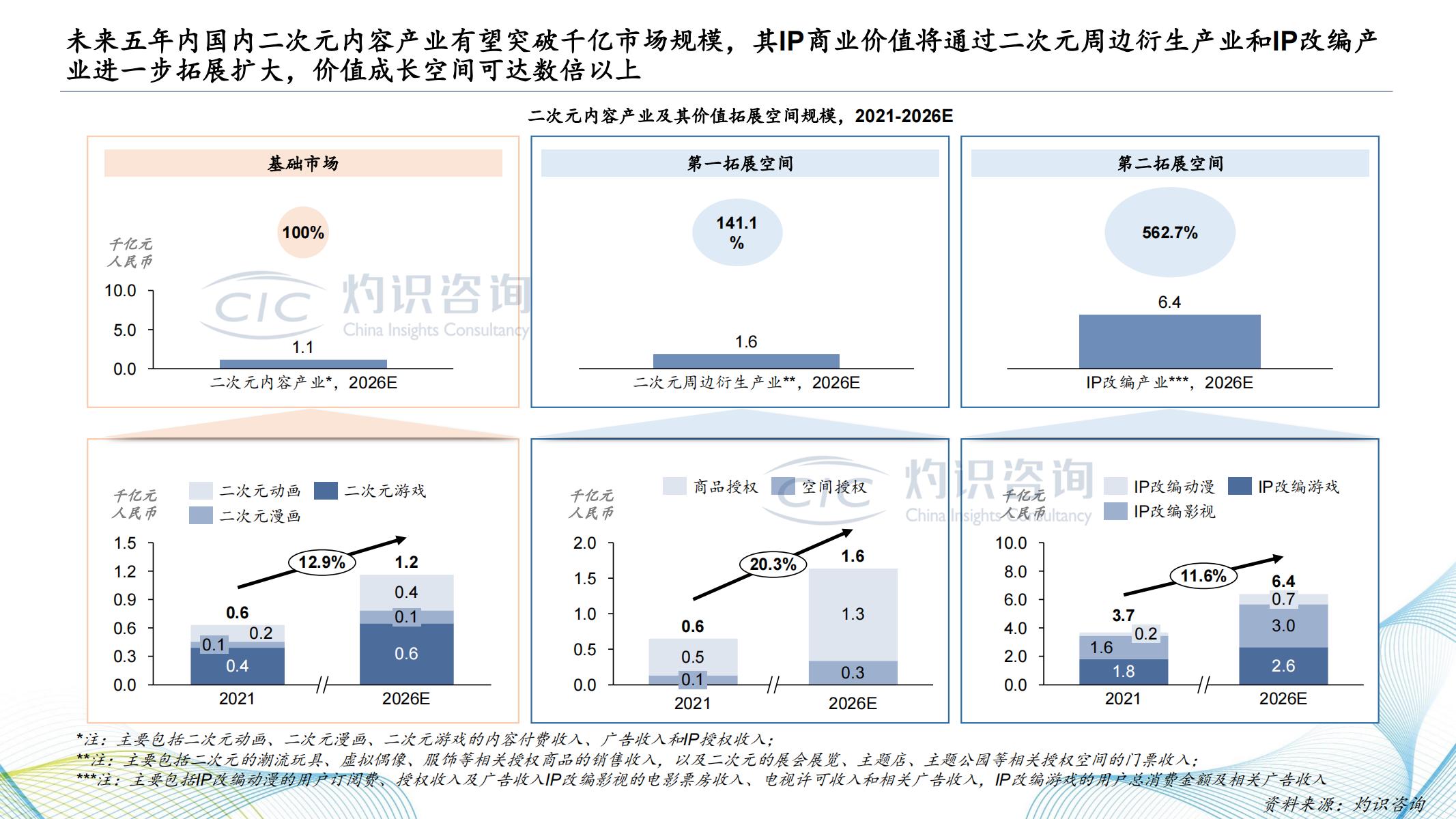 从定义来看,二次元主要指以二维图像构成的平面架空世界,其内容载体主要为ACGN或ACG,细分产业板块包括二次元周边衍生产业。本文主要探讨其中的二次元内客产业情况(包括二次元漫画、二次元动画和二次元游戏),聚焦二次元动漫产业的现状和发展机遇。当下国内的二次元内容产业已经从萌芽走向成熟,市场规模不断提升且商业化潜力较大。其中Z世代群体强助的消费能力、优质内容创作进步、科技发展、政策和资本支持都为二次元内容产业的成长提供了强劲的驱动力。预计未来五年内二次元内客产业规模将突破千亿人民币,其中动漫产业占比特超过44%。通过二次元周边衍生产业和P改编产业的拓展,二次元内容IP的商业价值成长空间可进一步扩大数倍以上。
