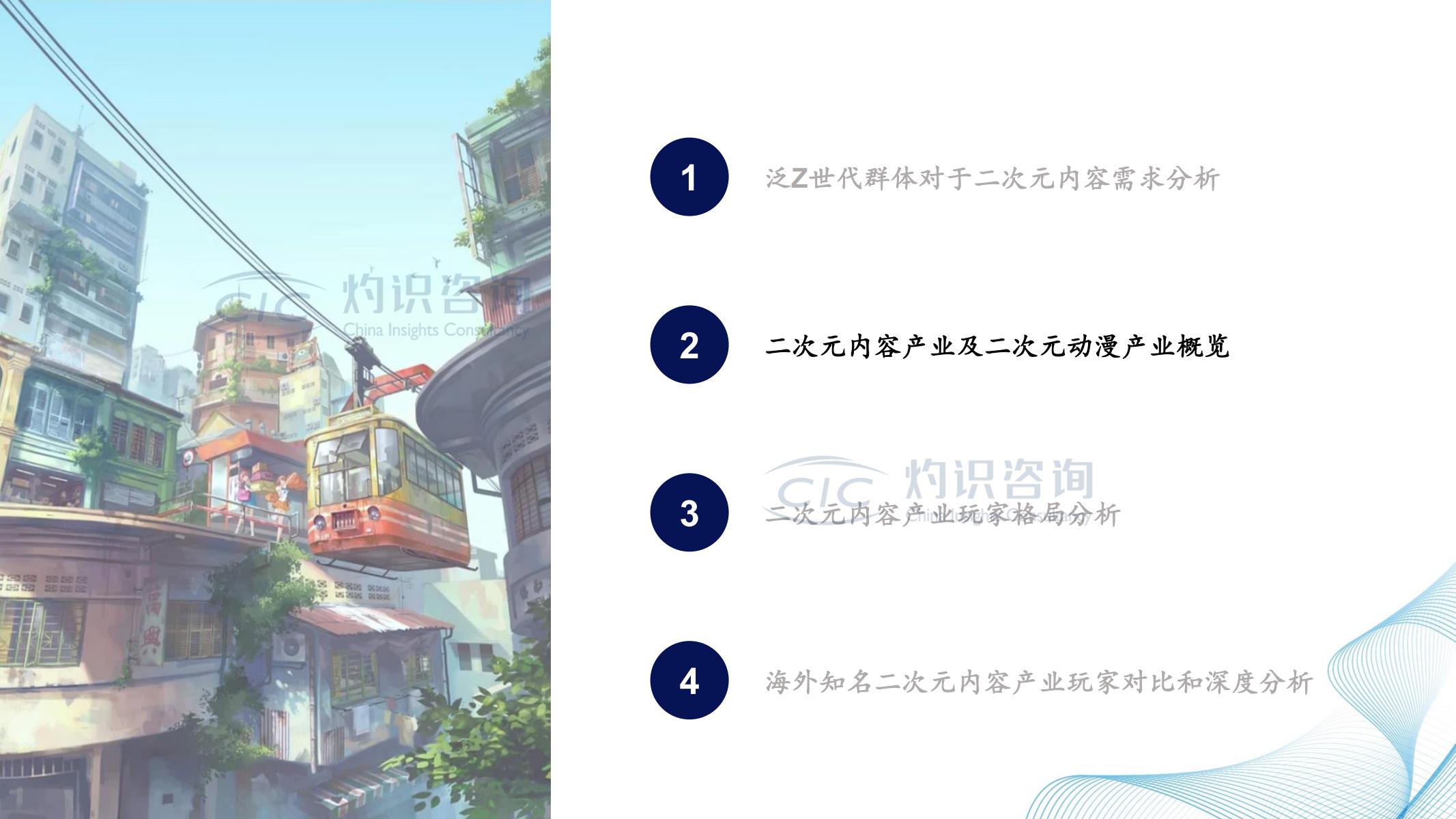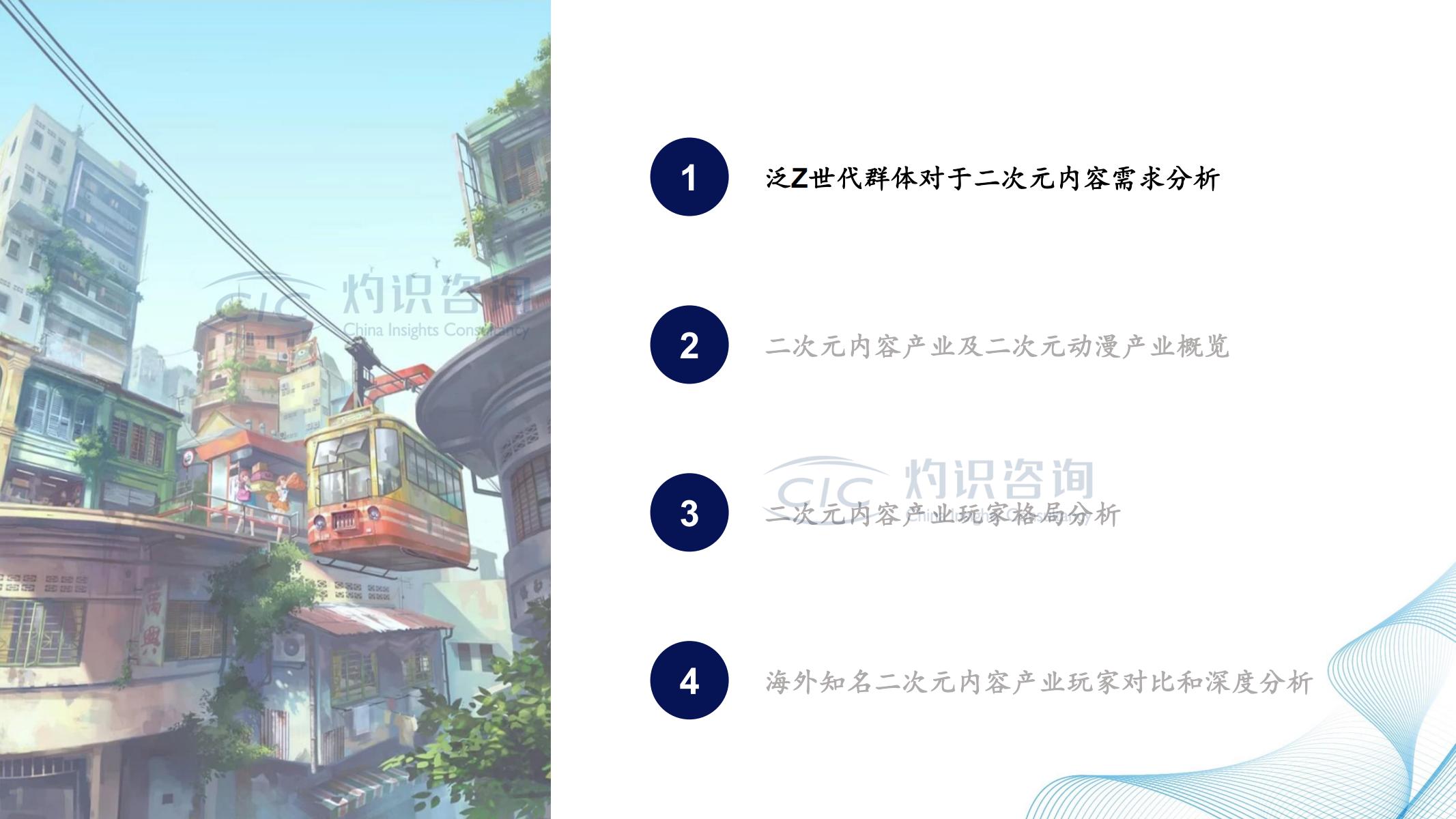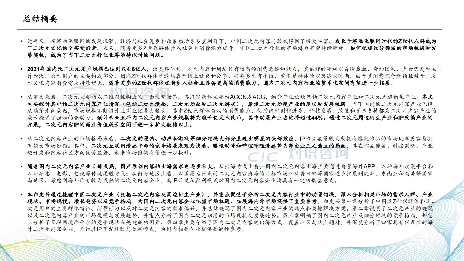 本白皮书通过梳理中国二次元产业(包括二次元内容及周边衍生产业),并重点聚焦于分析二次元内容行业中的动漫领域,深入分析相关市场的需求人群、产业现状、市场规模、增长趋势以及竞争格局,为国内二次元内客企业把握市场机遇、拓展海内外市场提供了重要参考。白皮书第一章分析了中国泛Z世代群体和泛二次元用户的主要群体特征、消费行为以及对二次元内容的需求偏好,并总结概况了国内二次元内容产业的痛点和关键解决方案。第二章说明了二次元产业的概况以及二次元内容产业的市场规模与发展趋势,并重点分析了国内二次元动漫的市场现状及发展趋势。第三章明确了国内二次元产业及细分领域的竞争格局,并重点分析了互联网漫画平台的竞争现状和关键成功因素。第四章主要介绍了国内二次元内容的出海方式、覆盖地区与热点题材,并深度分析了四家具有代表性的海外二次元内容企业,总结其IP开发经验与盈利模式,为国内相关企业提供关键性参考。
