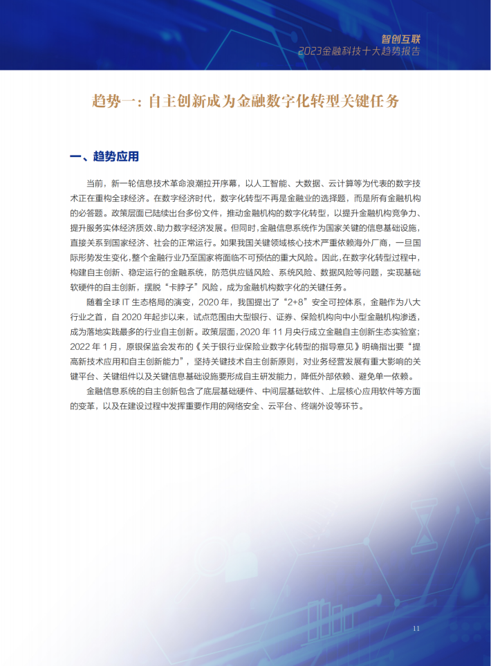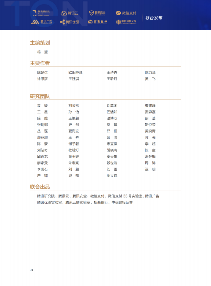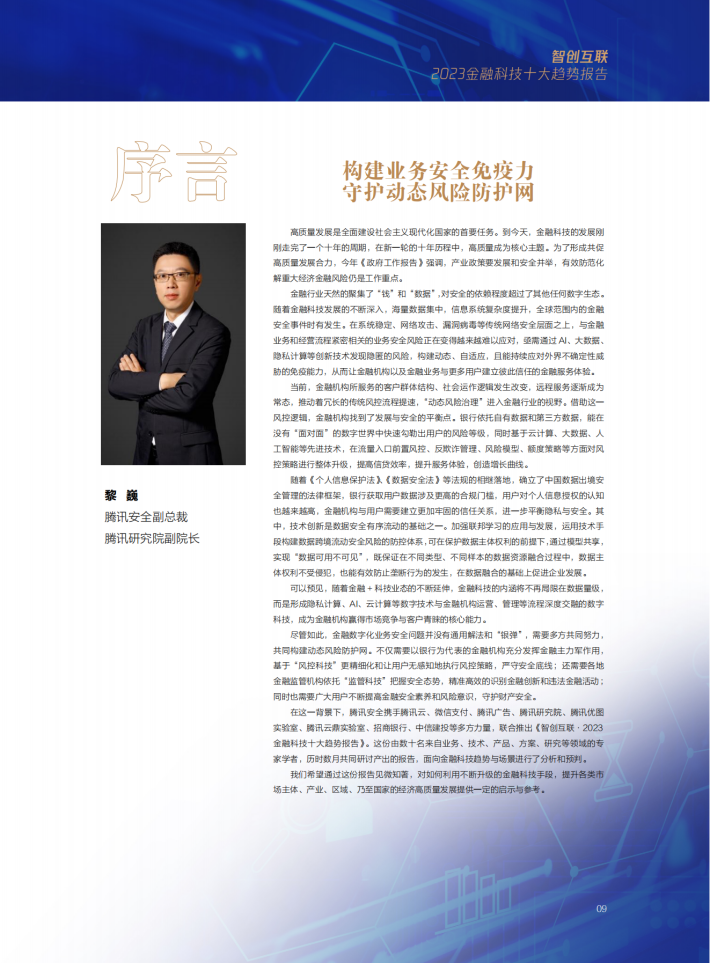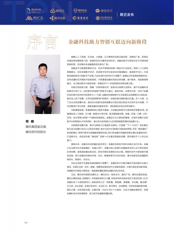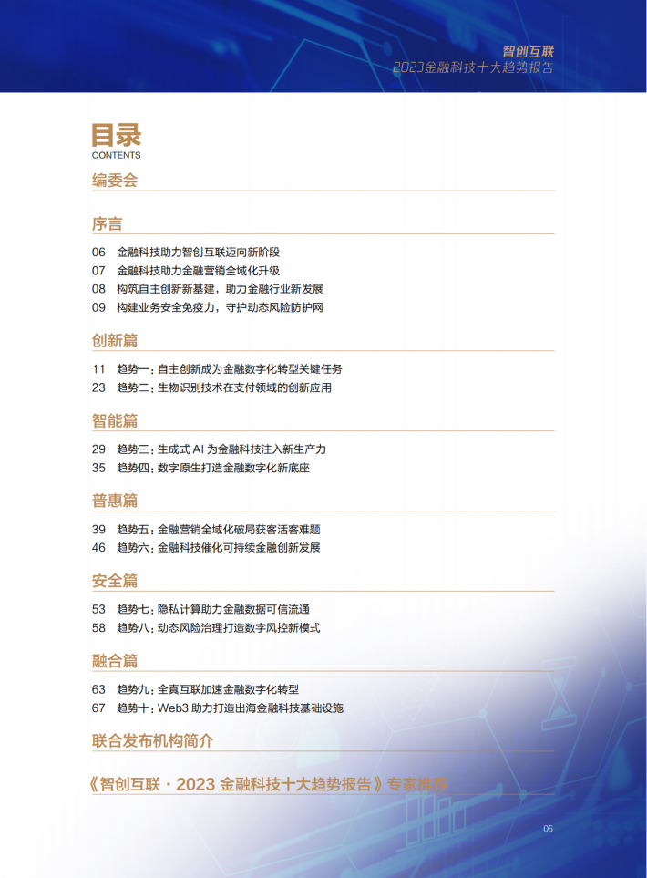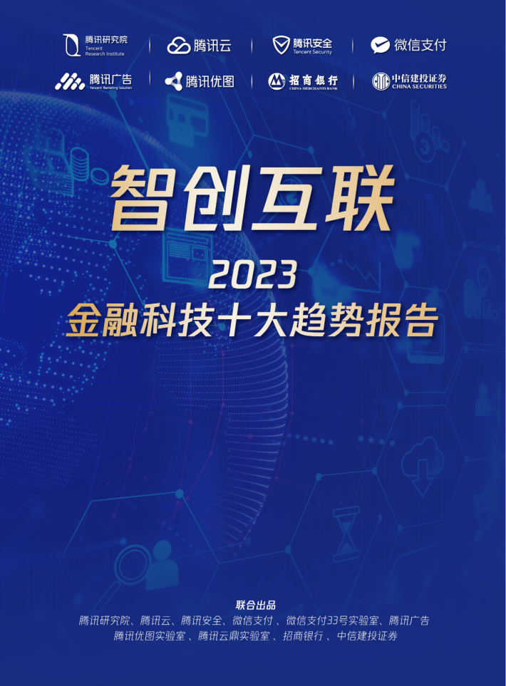 为此,腾讯研究脘联合腾讯云、腾讯安全、微信支付、腾讯广告、腾讯优图实验室、腾讯云鼎实验室、招商根行、中信建投等多方力量,共同发布研究报告项目《智创互联·2023金融科技十大趋势报告》。趋势报告分为“创新篇、智能篇、普惠篇、安全篇、融合篇”五大类,自主创新、生物识别技术、生成式A、数字原生、全域营销、可持续金融创新发展、隐私计算、动态风险治理、全真互联、Web3共计十大趋势,立足于金融发展研究,探素金融科技未来发展趋势,助力经济金融高质量发展。