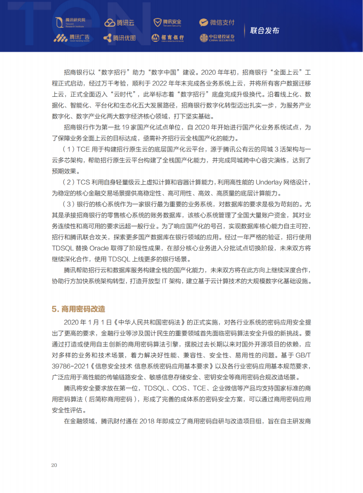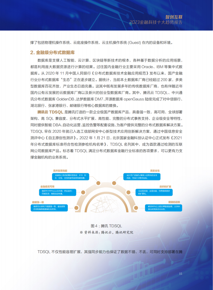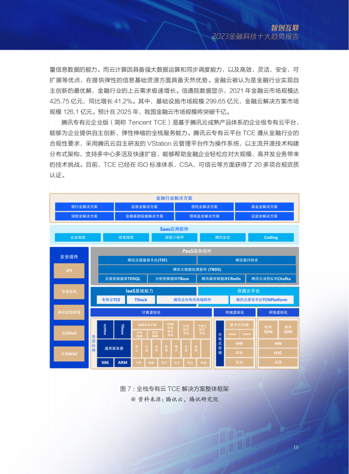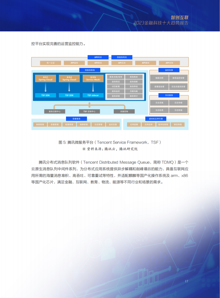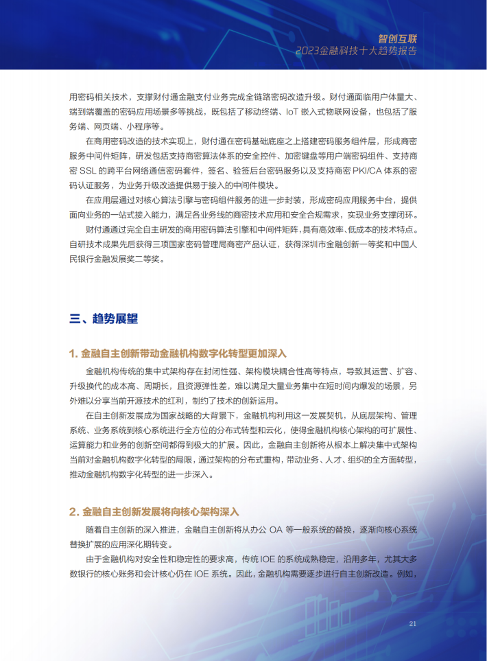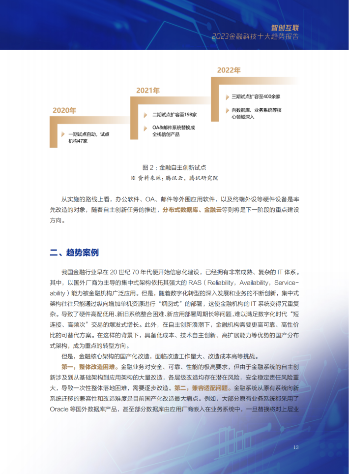为此,腾讯研究脘联合腾讯云、腾讯安全、微信支付、腾讯广告、腾讯优图实验室、腾讯云鼎实验室、招商根行、中信建投等多方力量,共同发布研究报告项目《智创互联·2023金融科技十大趋势报告》。趋势报告分为“创新篇、智能篇、普惠篇、安全篇、融合篇”五大类,自主创新、生物识别技术、生成式A、数字原生、全域营销、可持续金融创新发展、隐私计算、动态风险治理、全真互联、Web3共计十大趋势,立足于金融发展研究,探素金融科技未来发展趋势,助力经济金融高质量发展。