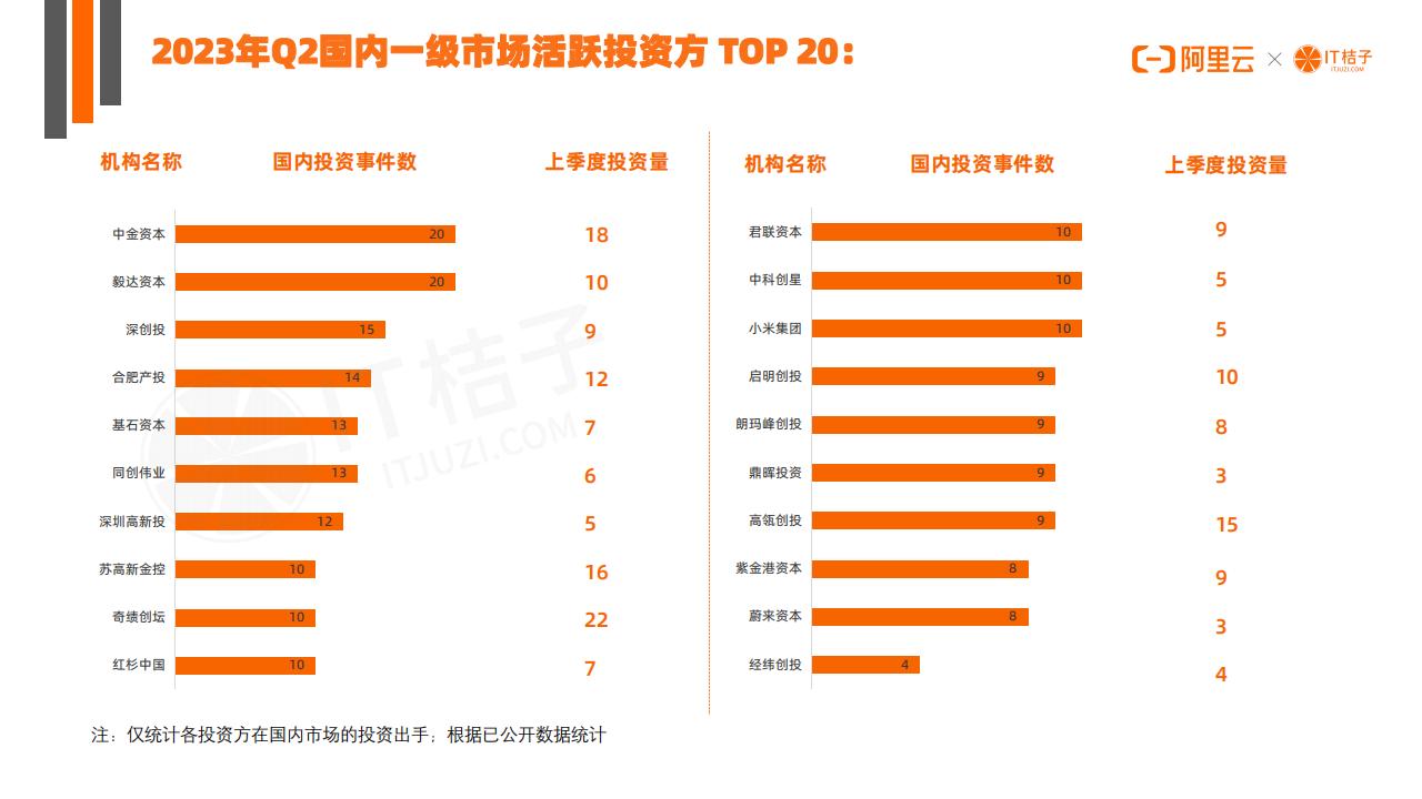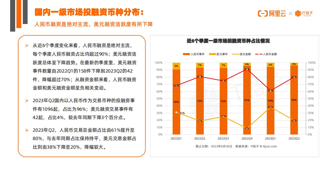 2023年Q2国内以人民币作为交易币种的投融资事件有1096起,占比为96%;美元融资交易事件有42起,占比4%,较去年同期下降3个百分点。