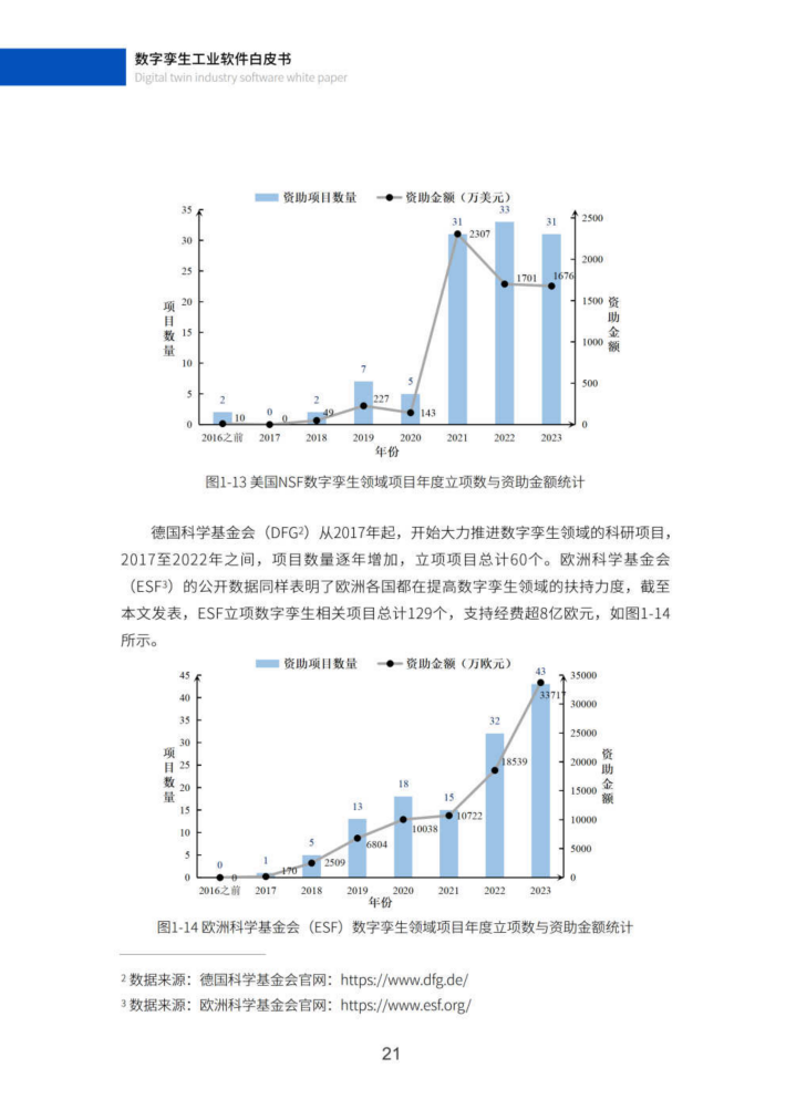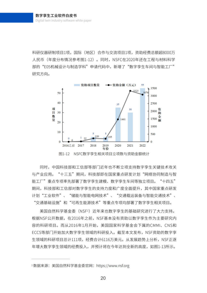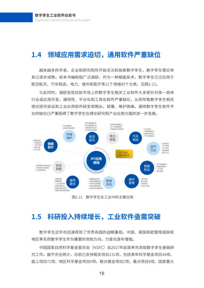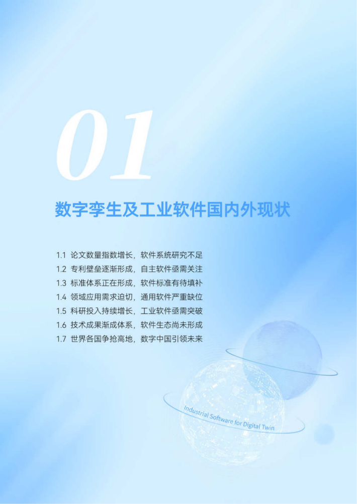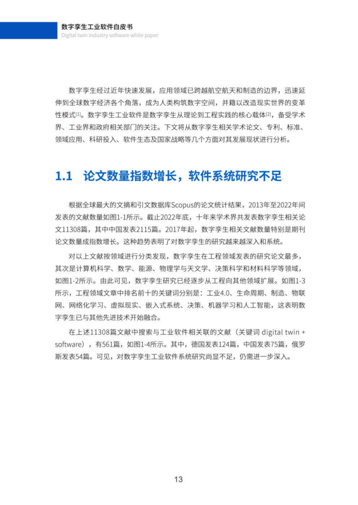 数字孪生经过近年快速发展,应用领域已跨越航空航天和制造的边界,迅速延伸到全球数字经济各个角落,成为人类构筑数字空间,并籍以改造现实世界的变革性模式1。数字孪生工业软件是数字孪生从理论到工程实践的核心载体(21,备受学术界、工业界和政府相关部门的关注。下文将从数字孪生相关学术论文、专利、标准、领域应用、科研投入、软件生态及国家战略等几个方面对其发展现状进行分析。