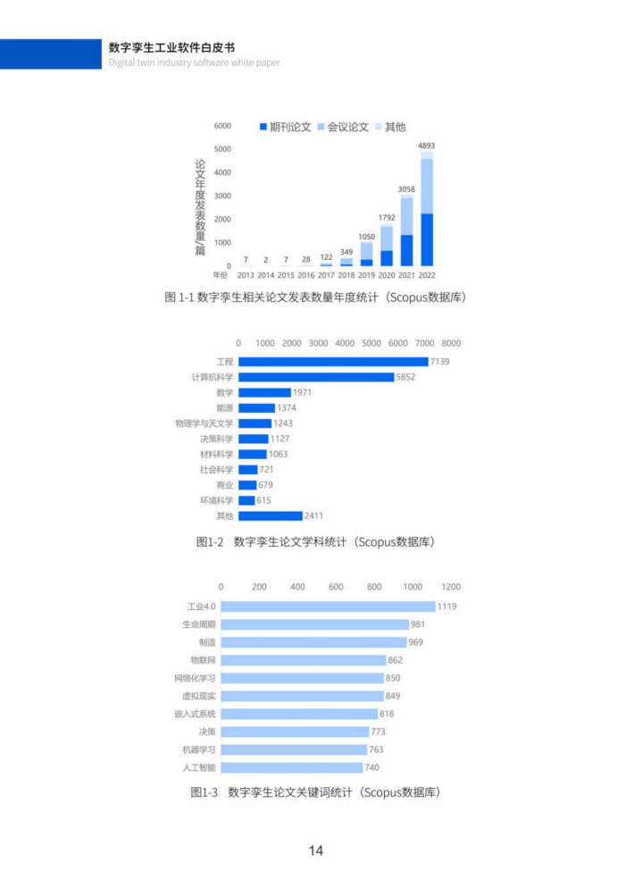 根据全球最大的文摘和引文数据库Scopus的论文统计结果,2013年至2022年间发表的文献数量。截止2022年底,十年来学术界共发表数字孪生相关论文11308篇,其中中国发表2115篇。2017年起,数字孪生相关文献数量特别是期刊论文数量成指数增长。这种趋势表明了对数字孪生的研究越来越深入和系统。