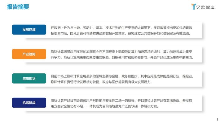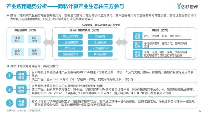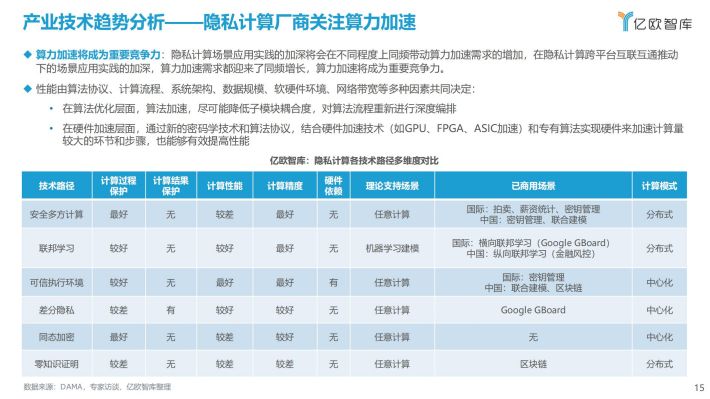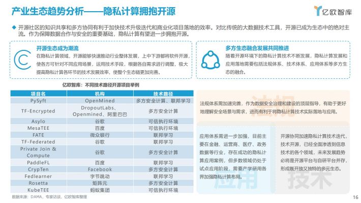 隐私计算场景应用实践的加深将会在不同程度上同频带动算力加速需求的增加,算力加速将成为重要竞争力;隐私计算未来生态主要由数据源、数据使用方和服务商参与,开源产品已成为生态中的主流。