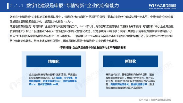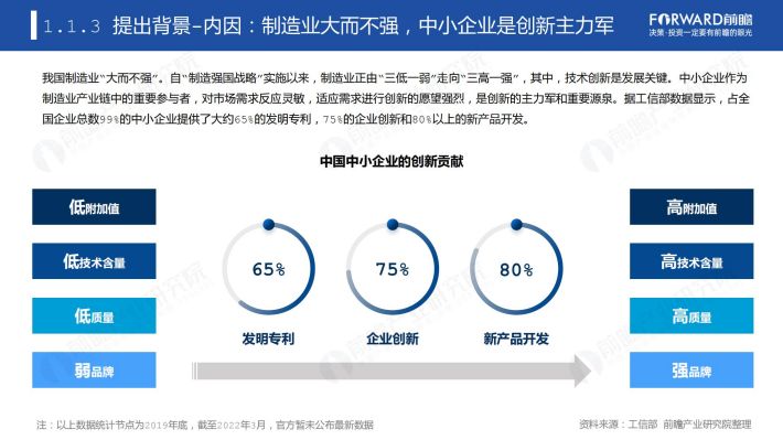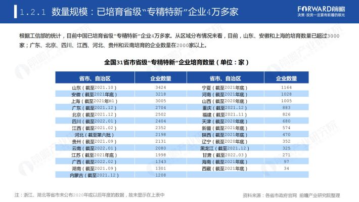 《关于支持"专精特新"中小企业高质量发展的通知》指出∶2021-2025年,中央财政将累计安排100亿元以上奖补资金,分三批(每批不超过三年)重点支持1000余家国家级专精特新“小巨人”企业高质量发展,带动1万家左右中小企业成长为国家级专精特新“小巨人”企业。《^十四五“促进中小企业发展规划》则明确了"百十万千"的培育目标,"十四五"时期我国将推动形成一百万家创新型中小企业、十万家"专精特新"中小企业、一万家专精特新"小巨人"企业。