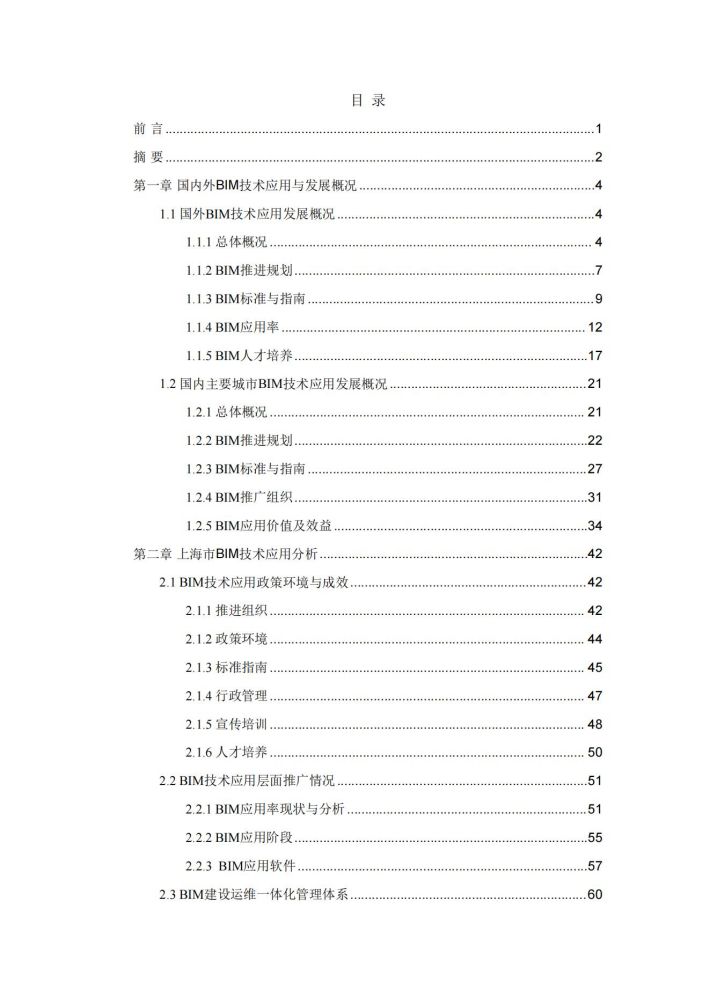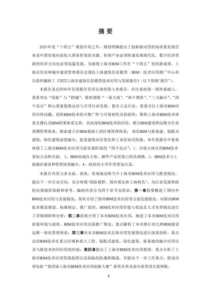 本报告对国内外BIM技术应用发展最新情况进行了详尽调研分析,针对上海市BIM技术应用发展情况进行了细致总结。报告对本市BIM技术应用发展具有重要借鉴意义,但由于编制组精力与编制时间有限,加之BIM技术应用仍处于不断发展过程中,本报告难免存在不当之处,欢迎各位读者多多批评指正,以期在今后的编制工作中逐步完善。