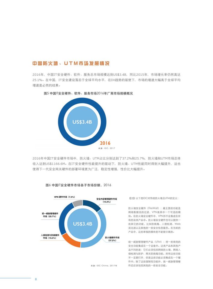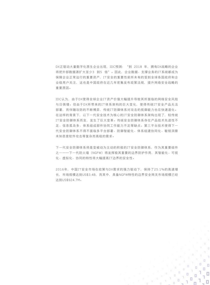 2016年,中国IT安全市场在政策与DX需求的强力驱动下,保持了25.1%的高速增长,市场规模达到US$3.4B,而其中,具备NGFW特性的边界安全网关市场规模已经达到US$924.7M。