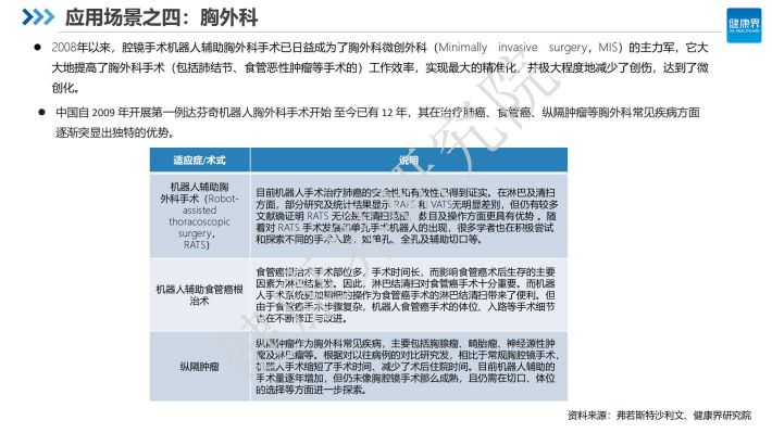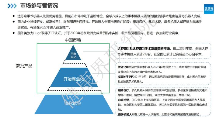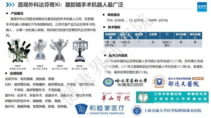 中国∶2006年北京解放军总医院的高长青教授引进了第一台达芬奇、系统,开启了中国大陆机器人手术的历史。继北京引进第一台达芬奇机器人后,2009年上海同时有4家医院引进了该系统,并开展了胸外科手术,同年国家卫生部紧急禁止机器人手术及机器的购入,直至2012年才重新开放审批,2013年再次开始装机之后国内企业也开始加大这一领域的研发。