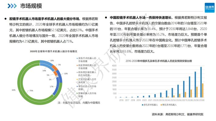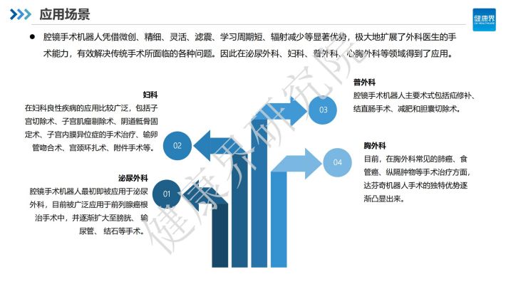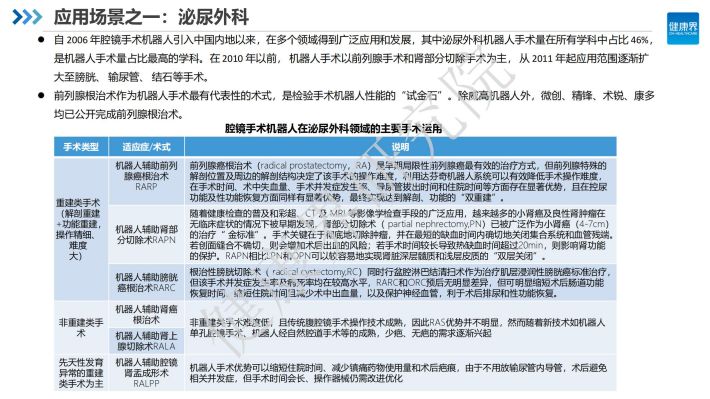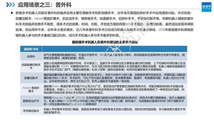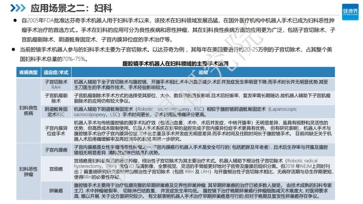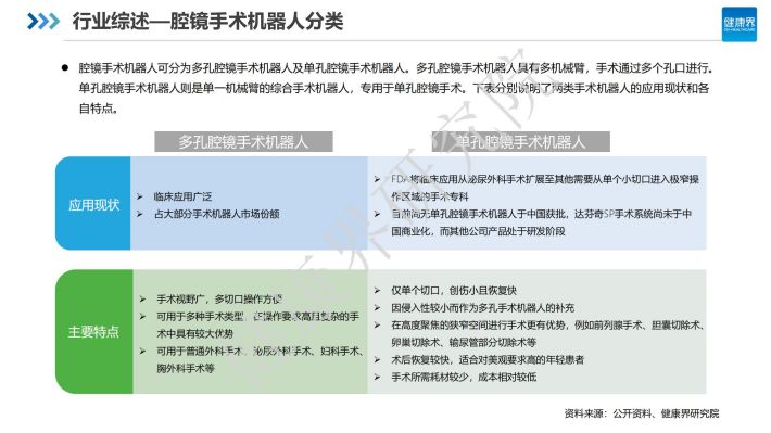 腔镜手术机器人可分为多孔腔镜手术机器人及单孔腔镜手术机器人。多孔腔镜手术机器人具有多机械臂,手术通过多个孔口进行。单孔腔镜手术机器人则是单一机械臂的综合手术机器人,专用于单孔腔镜手术。下表分别说明了两类手术机器人的应用现状和各自特点。