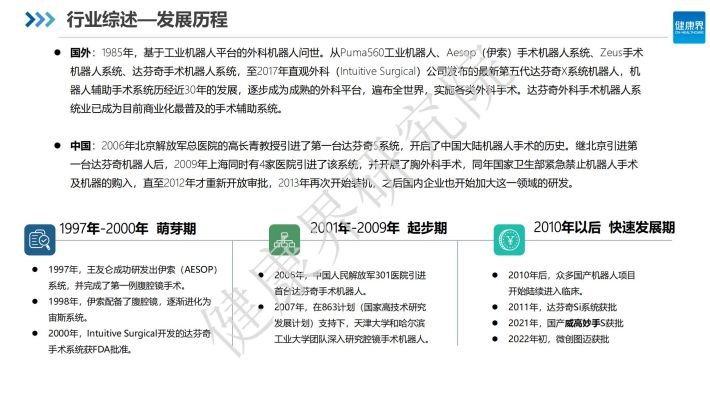 国外∶ 1985年,基于工业机器人平台的外科机器人问世。从Puma560工业机器人、Aesop(伊索)手术机器人系统、Zeus手术机器人系统、达芬奇手术机器人系统,至2017年直观外科(Intuitive Surgical)公司布的晨新第石代达芬奇X系统机器人,机器人辅助手术系统历经近30年的发展,逐步成为成熟的外科平台,遍布全世界,实施各类外科手术。达芬奇外科手术机器人系统业已成为目前商业化最普及的手术辅助系统。