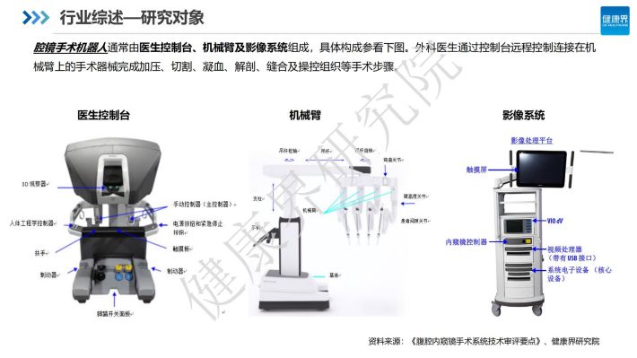 腔镜手术机器人通常由医生控制台、机械臂及影像系统组成,具体构成参看下图。外科医生通过控制台远程控制连接在机械臂上的手术器械完成加压、切割、凝血、解剖、缝合及操控组织等手术步骤。