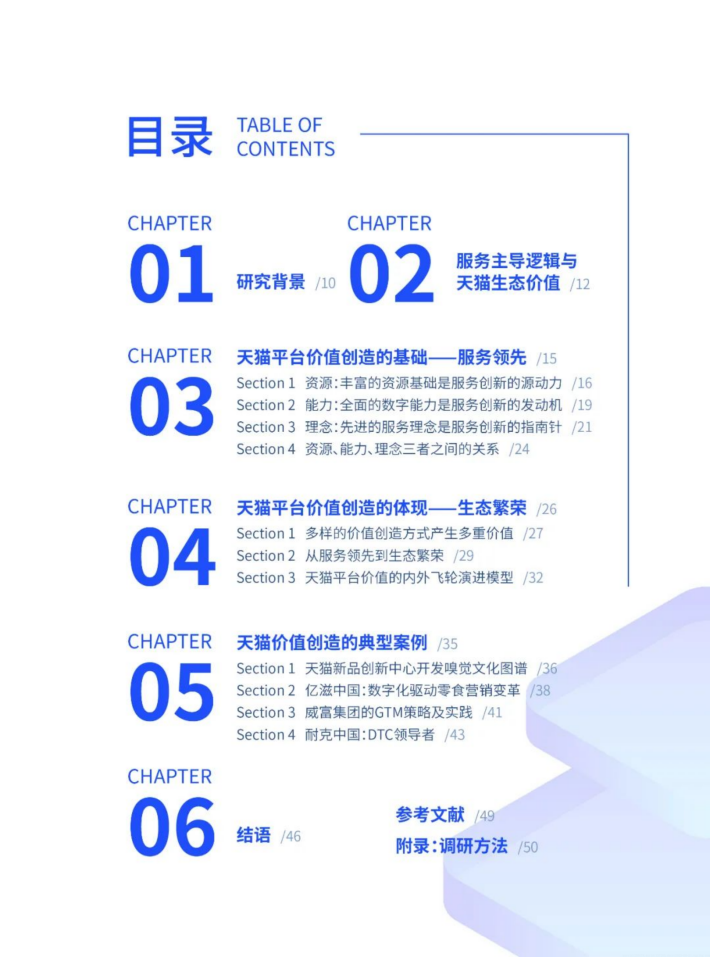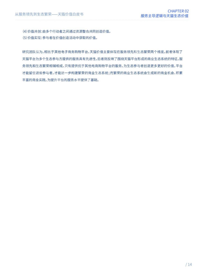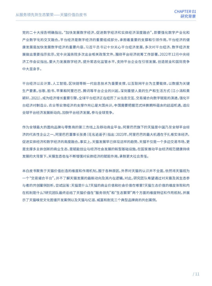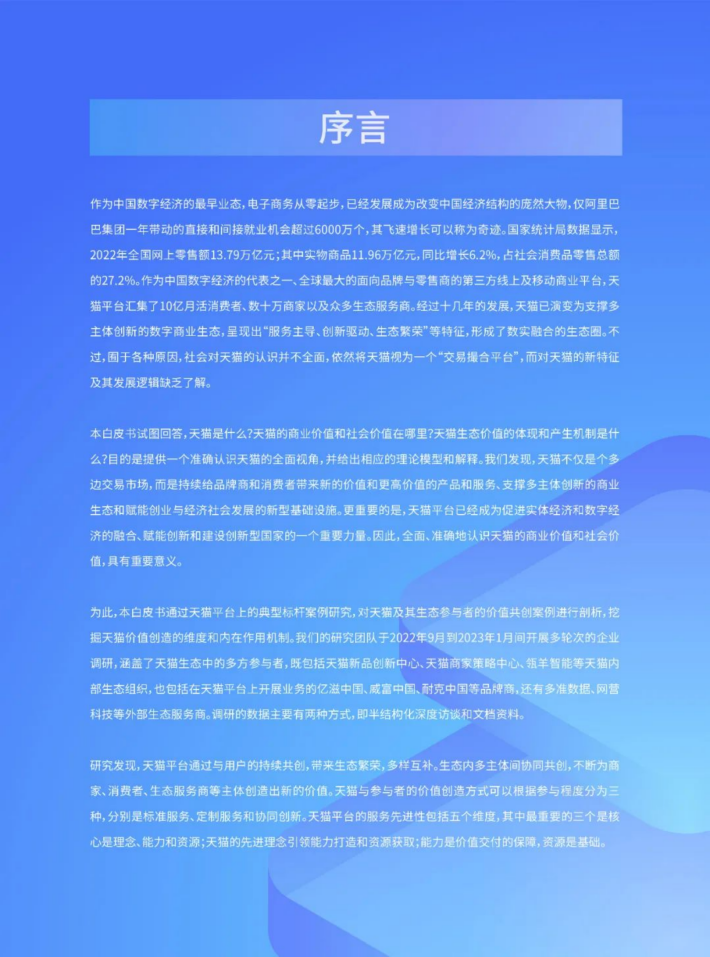 本白皮书试图回答,天猫是什么?天猫的商业价值和社会价值在哪里?天猫生态价值的体现和产生机制是什么?目的是提供一个准确认识天猫的全面视角,并给出相应的理论模型和解释。我们发现,天猫不仅是个多边交易市场,而是持续给品牌商和消费者带来新的价值和更高价值的产品和服务、支撑多主体创新的商业生态和赋能创业与经济社会发展的新型基础设施。更重要的是,天猫平台已经成为促进实体经济和数字经济的融合、赋能创新和建设创新型国家的一个重要力量。因此,全面、准确地认识天猫的商业价值和社会价值,具有重要意义。